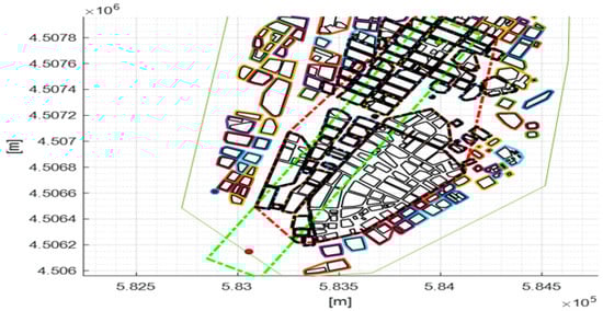 Keep-out geofence polygon extraction for UAS flight planning. The initial ROI (green dashed line) is a rectangular box per Figure 5. Keep-out geofences (solid black lines) inside or intersecting the rectangular ROI box are found using polygon intersection and point-in-polygon operations. The final ROI (red dashed line) is the convex hull around these keep-out geofences. For our simulation, m.