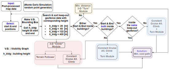 Flow chart of pathfinding logic for different start and end locations. In the chart, V.G. abbreviates visibility graph, and is the height of a geofence around a cluster of buildings. If the departure/destination is not inside the keep-out geofence ROI box, at start/end point is set to street/terrain altitude.