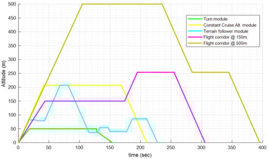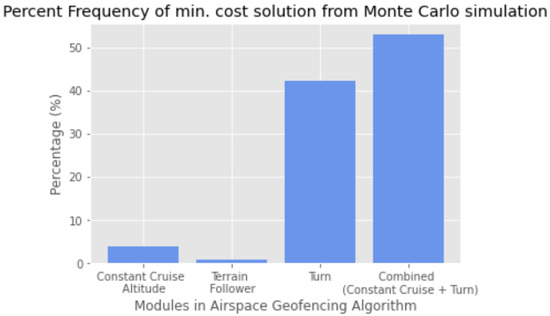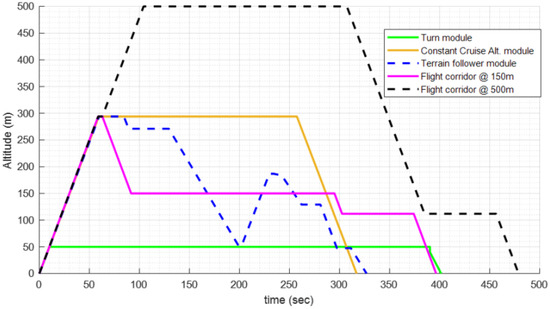 Our airspace volumization algorithm used this condition to choose one of the fixed-altitude datasets described in Section 4. As becomes larger, fewer obstacles were present, so fewer calculations were needed to generate and plan a flight through the visibility graph. For each case, cost values of the four planning options (“turn”, “constant cruise alt.”, “terrain follower”, “combined (constant cruise altitude + turn)” ) were calculated using Equation (2), and the minimum cost solution was selected as the best solution. Note in the Manhattan data the “wait” solution was never used because buildings are permanent, resulting in static geofence obstacles only.
