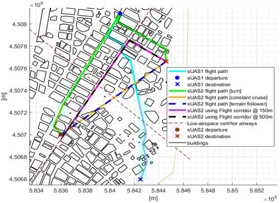 AAM operations, including but not limited to Urban Air Mobility (UAM), are envisioned to have higher altitudes than 400 AGL, where current UTM is designed to serve. Researchers at NASA and Uber investigated the applicability of UTM to coordinate UAM routes safely and efficiently [24]. In their case studies, “Transit-Based Operational Volumes (TBOVs)” were used to wrap the UAM flight path, a notion analogous to the trajectory keep-in geofence discussed in this paper. Inspired by the static “UAM-authorized airspace” active over a fixed duration [24] as an airspace management alternative to geofencing, in our case studies, we designed fixed flight corridors and simulated sUAS flight missions operating in these flight corridors. This alternative solution offers a benchmark with which our dynamic geofence volumization and path planning solutions are compared (Section 5).