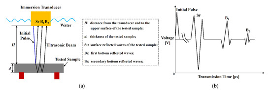 Schematic diagram of the immersion pulse reflection method: (a) the transmission process of ultrasonic waves; (b) the transmission time of ultrasonic waves.