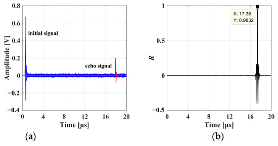 The sampling frequency of the signal was set as 2.5 GHz, and the TOF between the initial and echo signals was set as 17.36 μs. To come closer to the actual measurement signal, Gaussian noise with +15 dB SNR (Signal-to-Noise Ratio) was added to the ideal declining sinusoidal signal. The simulated signal waveform and the correlation distribution calculation results are shown in Figure 2a,b, respectively.