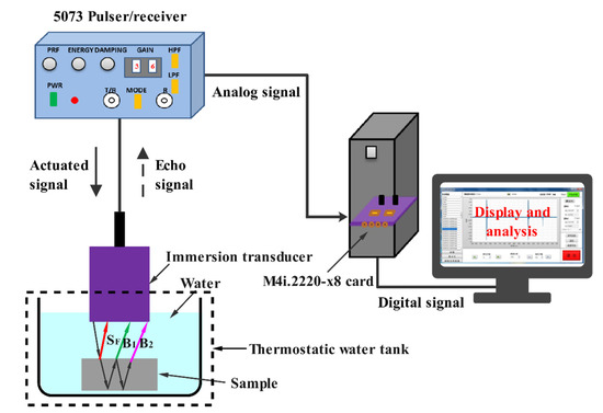 The schematic diagram of the . measurement experimental system is illustrated in Figure 4. A 75 MHz ultrasonic pulser/receiver (Olympus, Waltham, MA, USA, model 5073PR) was used, which was connected to a 400 MHz data acquisition card (Spectrum Instrumentation GmbH, Grosshansdorf, Germany, model M4i.2220-x8) that transmits the ultrasonic signals to a computer to be processed. All signals were captured with 2,500,000 points at a sampling rate of 2.5 GHz. After the acquisition, the data were properly processed to determine the involved ultrasonic velocities. The temperature of the tested sample was controlled by a thermostatic water tank (Hangzhou Qiwei, Hangzhou, China, model DHC-05-B) with a temperature control precision of ±0.05 °C.