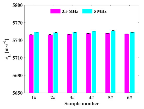 The self-generating and self-receiving transducer model was utilized to transmit and receive the ultrasonic waves. Considering the diameter and thickness of the tested sample, wideband focusing 19.05 mm diameter longitudinal wave immersion transducers (Olympus, Waltham MA, USA) with 3.5 and 5 MHz nominal center frequencies were employed in this investigation. Figure 5 illustrates the ultrasonic velocity measurement results for the samples 1#~6# at 20 °C using two different ultrasonic frequencies: 3.5 and 5 MHz. Each sample was subjected to five replicate measurements by each transducer. The ultrasonic frequency had little effect on the ultrasonic velocity of the sample, as the in the sample only depends on its inherent physical parameters, including its bulk modulus and density [25]. In addition, the repeatability of the measurement was essentially the same for both frequency transducers, both within 0.1 m/s. This suggests that any frequency could be used to characterize the CTE of ULE glass in engineering applications when using ultrasonic velocity measurement methods.