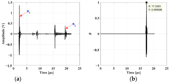 The correlation calculation result of an actual received ultrasonic signal: (a) the ultrasonic echo signal; (b) the correlation coefficient distribution.