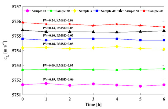 To determine whether the proposed measurement system could provide reliable measurements over long periods of time, the stability of the measured value also needs to be considered when the tested samples reach thermal equilibrium. Long-term measurement of the ultrasonic velocity in samples 1#~6# with a high CTE was taken at the same temperature (20 °C), and the data were recorded at 1 h intervals, for a total of seven measurements in one day. Figure 7 depicts the variation in with the measurement time.