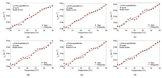 Changes in (m∙s−1) with temperature for all measured samples: (a) sample 1#; (b) sample 2#; (c) sample 3#; (d) sample 4#; (e) sample 5#; (f) sample 6#.