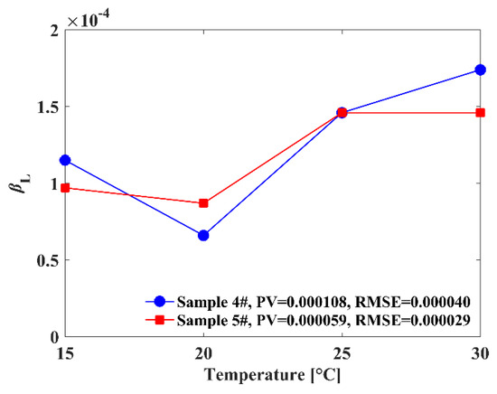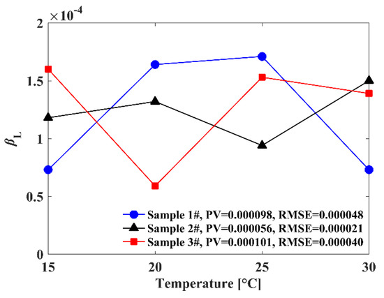 Here, we take the corresponding to 10 °C of the samples as the basis , and calculate the via Equation (24) with temperature increments of 5 °C, i.e., at 15 °C, 20 °C, 25 °C, and 30 °C. The for samples 1#, 2#, and 3# is shown in Figure 9. We noted that for the different temperature ranges, the speed of the ultrasonic velocity changes with the temperature was inconsistent. This is possibly because the elastic modulus also has a temperature coefficient , which varies in different temperature ranges. The PV value of for the three samples was 0.000098, 0.000056, and 0.000101. Considering that the difference was minor, we conclude that the multi-data point fitting method that was used to obtain in a given temperature range in this paper is a more feasible equivalent to an average function and has wider temperature applicability.