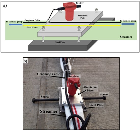The main components of land-streamers (Figure 1a) are (a) the geophone, which could be a P-wave or S-wave receiver, (b) the plate, which is a heavy metal that enhances the coupling between the receiver and the ground. In our design, we have two plates, the lower is a steel plate and the upper is aluminum. We also added two side wings made of iron to increase stability during the acquisition (Figure 1b,c) the streamer, which is any tough material that can connect all plates together, (d) the cables that connects the receivers to the recording system, and (e) the recording system. Components (a–d) are connected to each other (Figure 1b) and moved to/from the field as one unit, which saves a lot of installing time at the field.