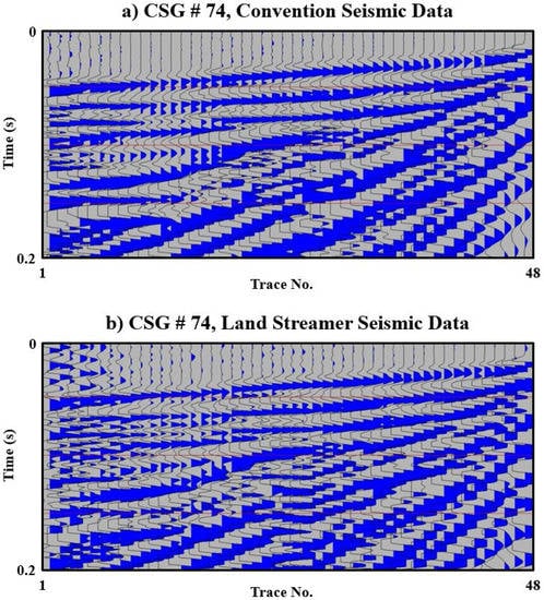 Shot gather no. 74 for both (a) conventional and (b) land-streamer data set.