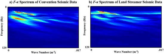 Shot gather no. 74 for both the conventional and land-streamer data sets are converted to the frequency-wavenumber (F−κ) domain (Figure 5). Both spectra show that the frequency content of both data sets are similar, especially for the low-frequency part. The differences between the spectra in Figure 5a,b could be due to the better coupling of the conventional receivers with the ground.