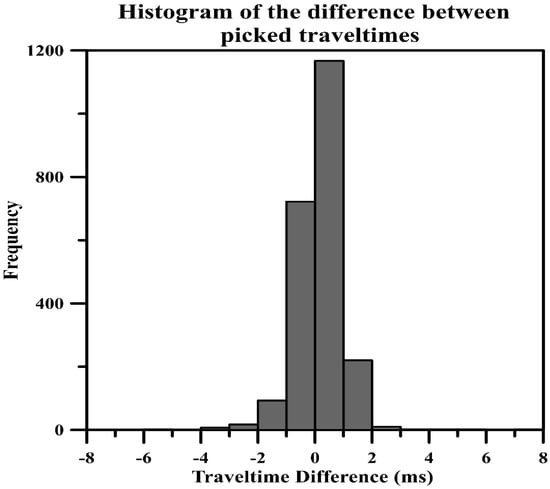 The histogram of the difference between first arrival traveltime picks of both conventional and land-streamer data sets. The differences between the traveltime picks of both data sets are smaller than ±4 ms.