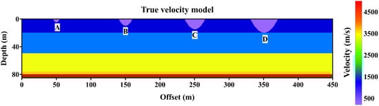 Figure 7 shows the synthetic velocity model used in this simulation. The model is 450 m long by 85 m deep. It shows 4 subsurface layers; all having a flat boundary and homogenous velocities. The velocity and thickness values are shown in Table 1. In this model, we used horizontal layers with homogeneous velocities to focus only on the effect of local anomalies. We added four local anomalies at offsets 50 m, 150 m, 250 m, and 350 m with a velocity of 400 m/s. The sizes of these anomalies are gradually increasing in both spatial and vertical dimensions (Table 2), and all of them have the shape of half an oval. All four local anomalies are located within the first layer, which represents the weathering layer in this synthetic model.