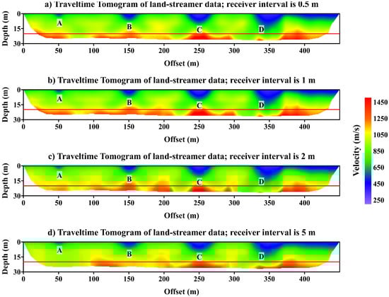 The traveltime tomograms of the land-streamer synthetic example. A, B, C, and D represents the four local anomalies added to the velocity model. The red-horizontal line represents the refractor between the first and second layers. (a–d) are the 0.5 m, 1 m, 2 m, and 5 m source and receiver intervals, respectively.