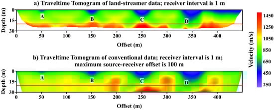 (a) The traveltime tomograms of the land-streamer synthetic example using 1 m receiver interval, it is the same tomogram shown in Figure 9b and repeated here for comparison. A, B, C, and D represents the four local anomalies added to the velocity model. (b) The traveltime tomogram of the conventional synthetic example using 1 m receiver interval and 100 m maximum source-receiver offset.