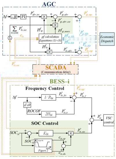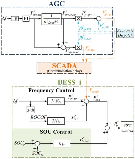 Proposed active power and frequency control scheme implemented locally (battery energy storage system-BESS) and centrally (automatic generation control-AGC).