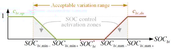 SOC needs to be supervised and regulated within its normal variation range, to avoid a detrimental effect on battery life, especially when BESSs participate in the provision of aFRR. In this paper’s implementation, SOC is regulated within the economic dispatch process, as explained in Section 3, to ensure sufficient energy reserves for sustained FCR and aFRR provision, in an economically optimal manner. Nevertheless, battery safety dictates that SOC monitoring and regulation are also implemented at the local battery system level, modulating its output power as needed. To this effect, the term is included in Figure 1, ensuring that SOC remains close to its reference , using a proportional (P) controller. SOC control is only activated when the SOC range limits are approached, as shown in Figure 2. Minimum (SOCbi,min−–SOCbi,min+) and maximum (SOCbi,max−–SOCbi,max+) zones are defined, allowing gradual activation of the SOC regulation module, according to coefficients cbi,up (green) and cbi,dn (red). As illustrated in Figure 2, cbi,up > 0 while SOCbi < SOCbi,min+ and cbi,dn > 0 while SOCbi > SOCbi,max−. The term is then superimposed on the output of the frequency regulation module , to prevent BESS under/over-charging. This imposed deviation of BESS output from the AGC command, as well as cbi,(up/dn), are fed back into the AGC to modify the participation factors of all units according to Equations (1)–(3), thus preventing any impact on secondary frequency regulation. Equations (1)–(3) are used distinctly for upwards participation factors’ calculations (using the subscript “up”), and downwards participation factors’ calculations (using the subscript “dn”). The upwards (downwards) BESS aFRR participation factor is affected only by cbi,up (cbi,dn), since high (low) BESS energy reserves do not restrict its upwards (downwards) secondary reserve provision capability.