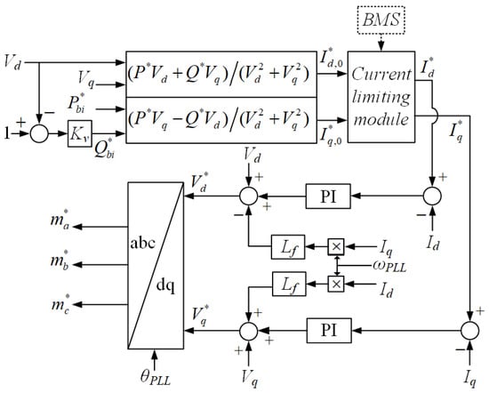The BESS converter controller is illustrated in Figure 3. More detail is provided in [59]. The BESS active power reference comes from the local BESS controller of Figure 1, while the reactive reference is the output of a proportional voltage controller. Between the two, active power is prioritized in the current limiting module, although this could be reverted, depending on system needs. BESS current limits are dictated by its rated capacity, as well as by its BMS monitoring various operating parameters. An L filter is used to interface the voltage source converter (VSC) to its output step-up transformer.