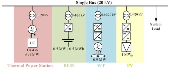 A pitch controlled, full-power converter WT is considered, whose MPPT module is based on a static optimum power–speed curve and a PI speed controller [67,68,69]. The PV system is simulated as in [22] and operated in MPPT mode. The load damping is considered negligible, due to the small scale of the electrical system [70]. The system parameters used for the simulations are summarized in Appendix A (Table A1 and Table A2).