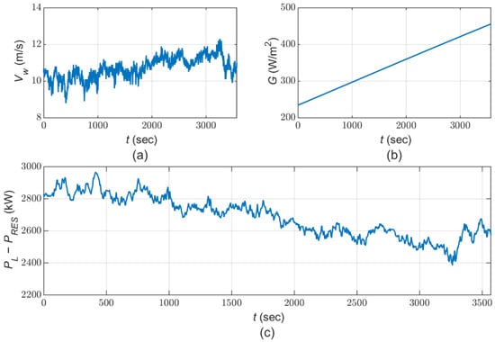 System response is simulated over an interval of one hour, using the wind and solar radiation timeseries depicted in Figure 7a,b. The resulting residual load (load-RES), supplied by the dispatchable units (DU and BESS), is shown in Figure 7c and corresponds to a constant load of 3.5 MW. No RES curtailments take place under the simulation conditions.
