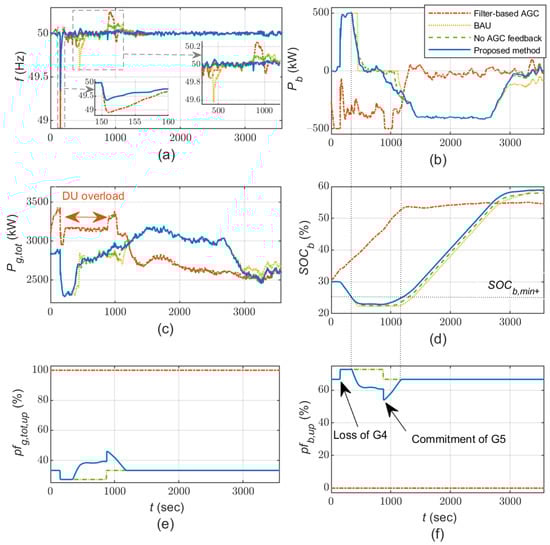 With the proposed method (case (iv)), the SOC control activation and the resulting reduction in BESS output and cb,up are both communicated back to the AGC system, reducing pfb,up and increasing pfgi,up, thus substituting the diminishing BESS contribution by other load-following units, as shown in Figure 8e,f. Step-changes noted in the aFRR participation factors when G4 is lost and G5 comes on-line (Figure 8e,f) are due to the normalization of pf values to a unity sum. In case (iii), the AGC is not informed of changes in BESS output, thus small frequency deviations are observed when the SOC enters its minimum zone (at ~6 min, see Figure 8a zoomed-in view). The BAU SOC control scheme results in more pronounced frequency deviations. Frequency disturbances are also noted in the filter-based AGC method when the BESS output power is saturated at the rated value (−500 kW), partly losing its capability to track the fast-varying component of the AGC signal.