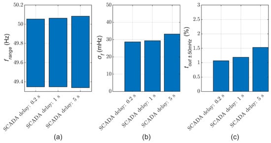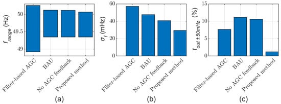 Improved frequency regulation performance of the proposed control scheme is also confirmed by the frequency quality metrics in Figure 9, due to smooth SOC control coordination with the AGC of the system. For example, the standard deviation of the frequency in the proposed method (case (iv)) is reduced by 49%, 38% and 28% in comparison to cases (i), (ii) and (iii), respectively.