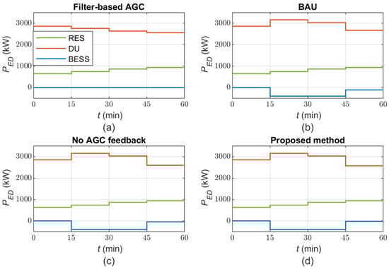 Economic dispatch results, for cases (i)–(iv). (a) Filter-based AGC, (b) BAU, (c) no AGC feedback, (d) proposed method.