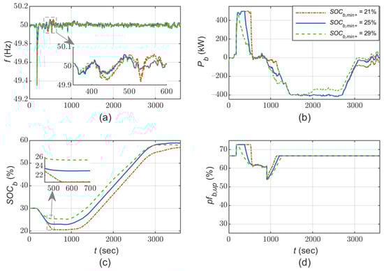 In the simulations presented in Section 5, it is assumed that the state of charge of each storage unit should be maintained within 20–90% (similarly as in [14,39,52,56]), thus SOCbi,min− and SOCbi,max+ are set at these values (see Table A2). Selection of SOCbi,min+ and SOCbi,max− parameters defines the SOC edge intervals where the battery has only partial contribution to frequency regulation. Selection of relatively high SOCbi,min+ and low SOCbi,max− values will reduce battery degradation and provide a smoother response in SOC edge intervals, but at the same time will result in under-exploitation of BESS regulation capabilities and reserves. In this work, a 5% range is considered sufficient, thus SOCbi,min+ and SOCbi,max− are set to 25% and 85%, respectively. A parametric evaluation is presented in Section 5.2.2, to show the effect of SOCbi,min+ on the performance of the proposed control method.