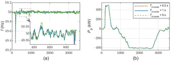 Although an island system is used as a study case, the proposed coordinated active power control method is also applicable in large-scale interconnected power systems (where tie-line power flows will also enter in area control error formation), without losing its simplicity and minimum signals/control modules required. In fact, the proposed method is built upon an established standard AGC scheme implemented in power systems around the world. The required real-time calculations of participation factors using Equations (1)–(3), as well as of the term , are simple and straightforward, while the three required signals per storage station (, , ) add no burden to the SCADA infrastructure. The need for storage systems to transmit SOC-related information to the system operator is already established in grid codes of island systems (e.g., Cyprus, [58]). The proposed local BESS controller is also easy to implement, as it only requires a SOC measurement, already available to the BMS, and very simple calculations.