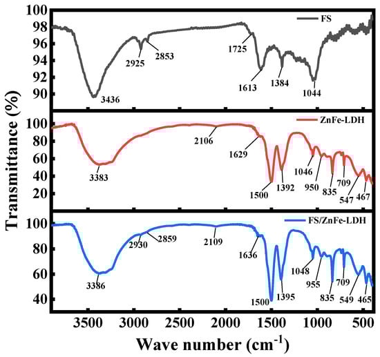 As we can see from the infrared spectra of the three lubricating materials in Figure 1 that the characteristic peaks of ZnFe-LDH and FS/ZnFe-LDH are very similar. However, FS is very different from ZnFe-LDH and FS/ZnFe-LDH, which indicates that the functional groups of ZnFe-LDH and FS/ZnFe-LDH are basically the same but distinct from FS. The hydroxyl C-OH was associated with the characteristic peak near 3400 cm in Figure 1. For the two materials FS and FS/ZnFe-LDH, the peaks of -CH2 bond were found at 2930 cm−1 and 2850 cm−1 separately. Moreover, for FS, the peak at 1725 cm−1 and 1613 cm−1 corresponded with the C=O bond (1725 cm−1) and the C=O bond on the aromatic ring (1613 cm−1). In the FS infrared spectrum, the peak that appears at 1384 cm−1 was caused by the C-H bond. The characteristic peak at 1044 cm−1 was assigned to the ether bond C-O-C. In the infrared spectra of ZnFe-LDH and FS/ZnFe-LDH these two materials, the peak of the O-C-O bond is observed, which is in the range of 1500–1636 cm−1. The peak at 1395 cm−1 (1392 cm−1) was caused by the symmetrical stretching vibration of carbonate O-C-O in the ν3 modes [22], and a peak that confirmed the presence of zinc hydroxylation (Zn-OH) was found near 950 cm−1 [23]. The three peaks appearing in the range of 835–1048 cm−1 were carbonate stretching vibrations. The two peaks at 465–549 cm−1 are related to the metal-oxygen bond [24,25].