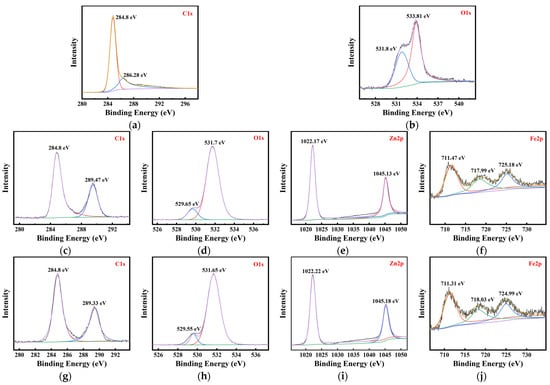 XPS fine spectra of ZnFe-LDH, FS/ZnFe-LDH, and FS. (a,b) FS; (c–f) ZnFe-LDH; (g–j) FS/ZnFe-LDH.