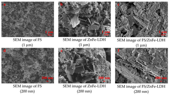 The SEM images of the three lubricating materials are seen in Figure 4. Figure 4a,d is FS, Figure 4b,e is ZnFe-LDH, Figure 4c,f is FS/ZnFe-LDH. As we can see from Figure 4, FS is an agglomeration composed of spherical carbon particles, but ZnFe-LDH and FS/ZnFe-LDH consist of nanoplates and particles. Compared with FS/ZnFe-LDH, ZnFe-LDH can be observed as more dispersed nanoplatelets, while FS/ZnFe-LDH is a stacked layered structure of nanoplatelets, with some particles and soot filling in between the nanoplatelets.