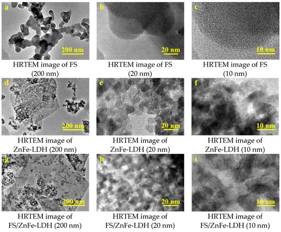 Scanning electron microscope(SEM) diagram of ZnFe-LDH, FS/ZnFe-LDH, and FS. From the HRTEM images of the above three lubricating materials in Figure 5, we know that FS consists of a few graphite crystallites and amorphous carbon and that ZnFe-LDH and FS/ZnFe-LDH mainly consist of nanoflakes. The nanoflakes in ZnFe-LDH are well dispersed, and the lattice strips are relatively clear. The surface layer of the FS/ZnFe-LDH nanosheets has soot and particles attached, and the lattice strips are more disorderly. Based on the analysis of the results of SEM and HRTEM, the nanosheets of FS/ZnFe-LDH and soot form a unique “sandwich layer” structure when used as a 10# WO lubricant additive, with tribological properties perhaps better than FS and ZnFe-LDH.