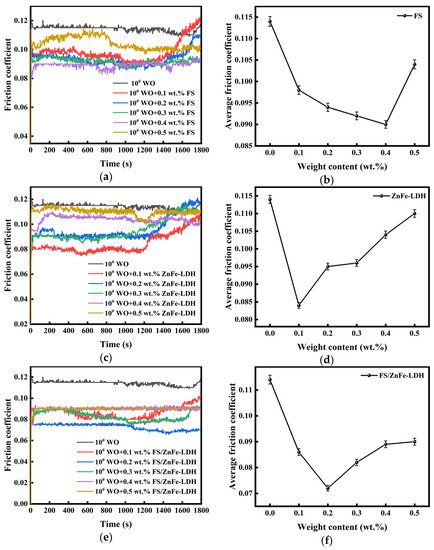 We used FS, ZnFe-LDH, FS/ZnFe-LDH, and 10# WO to prepare the oil samples required for the tribological experiment. Each lubricating material was equipped with five groups of oil samples with a weight content of 0.1–0.5 wt.%. We carried out a 1 h magnetic stirring treatment and 1 h ultrasonic dispersion treatment of the above-mentioned oil sample so that the lubricating material and the base oil were evenly mixed. After the oil sample was evenly mixed, it was immediately subjected to tribological experiments.