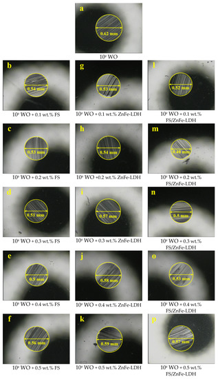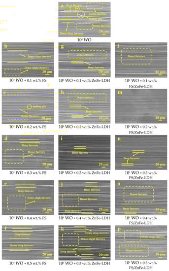 Figure 7a reveals the morphology of test ball wear scars under base oil, Figure 7b–f shows the morphologies of the lower test ball wear scars with different additions of FS, Figure 7g–k shows the morphologies of the lower test ball wear scars with different additions of ZnFe-LDH, and Figure 7l–p shows the morphologies of the lower test ball wear scars with different additions of FS/ZnFe-LDH.