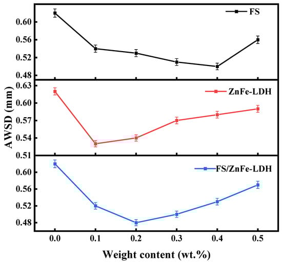 As we can see from Figure 7 and Figure 8, the average wear scar diameter (AWSD) of 10# WO was 0.62 mm, and the AWSD after adding the above three lubricating materials were all less than the AWSD of 10# WO. With the increase of the above three lubricating materials additions, the AWSD changes showed different trends. The oil sample with FS added had a decreasing and subsequently increasing AWSD change pattern. The minimum value of AWSD (0.5 mm) was reached when 0.4 wt.% FS was added. The AWSD of ZnFe-LDH was a continuously increasing trend. The minimum AWSD (0.53 mm) was reached at the concentration of 0.1 wt.%, 14.52% less than pure 10# WO. The AWSD of FS/ZnFe-LDH presented a V-shaped change trend, first decreasing and then increasing. The minimum AWSD (0.429 mm) was reached at 0.2 wt.% when the addition amount was 0.2 wt.%, 22.58% lower than the AWSD of 10# WO. The changing trend of AWSD was consistent with the changing trend of AFC. ZnFe-LDH has a certain anti-wear effect, but as the added content increases, its anti-wear performance is weakened. The reason is that ZnFe-LDH has poor dispersibility in 10# WO. FS/ZnFe-LDH’s surface is grafted with long carbon chains and its unique “sandwich layer” structure, which makes FS/ZnFe-LDH possess the best anti-wear performance.