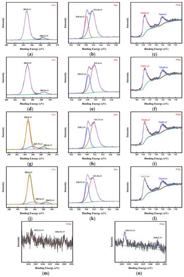 XPS diagram of wear scars (a–c) 10# WO; (d–f) FS; (g–i,m) ZnFe-LDH; (j–l,n) FS/ZnFe-LDH.