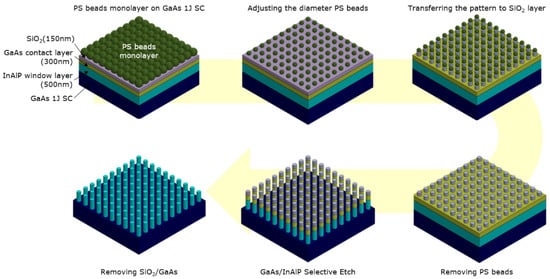 The inverted GaAs 1J SCs were grown on Si-doped (100) GaAs substrates oriented 2 °C off [111], through a metalorganic chemical vapor deposition (AIX200/4 RF, AIXTRON Inc., Cambridge, UK). Trimethylgallium, trimethylindium, and trimethylaluminum were employed as a group III source. Arsine and phosphine were employed as a group V source. Diethylzinc and disilane were employed as the p-dopant and n-dopant, respectively. The area of the fabricated SCs was 0.27 cm2. Commonly, the GaAs 1J SC was composed of a n+-GaAs Ohmic layer, n-InAlP window, n-GaAs emitter, p-pressure of 30 mTorr, and radio frequency power of 250 W for etching SiO2. The GaAs contact layer and InAlP window layer was etched using HBr and Ar gas by an inductive co GaAs base, and p-InGaP back surface field (BSF) layer as shown in Figure 1. The doping concentration and thickness of each layer were grown under the following conditions: a 0.3 μm p-type GaAs contact layer with a hole concentration of 1.49 × 1019 cm−3 and a GaAs bottom cell consisting of a 0.3 μm p-type GaAs contact layer with a hole concentration of 1.49 × 1019 cm−3, a 100 nm thick 3.94 × 1018 cm−3 p-type In0.51Ga0.49P back surface field (BSF) layer, a 3.3 μm thick 1.23 × 1017 cm−3 p-type GaAs base layer, a 100 nm thick 2.00E18 cm−3 n-type GaAs emitter layer, a 4.15E17 cm−3 n-type InAlP window layer, and a 0.3 μm thick 8.5 × 1019 cm−3 n+-type GaAs contact layer in succession. The doping concentrations of each layer were investigated by Hall measurement. The InAlP window layer with a thickness of ~500 nm was grown. Then, 150 nm of SiO2 was deposited on GaAs 1J SC by a plasma-enhanced chemical vapor deposition (PECVD) system (SLR-730, Oerlikon Corp., Freienbach, Switzerland). A monolayer of PS beads that floats on DI-water (diameter of ~400 nm, 4% w/v in DI-water, purchased from Thermo Fisher Scientific Corp., Waltham, MA, USA) was scooped by SiO2-deposited GaAs 1J SC and dried naturally. The diameter of dried PS beads was adjusted to ~300 nm by a reactive ion etching (RIE) system (FABstarRIE, Titiel Corp., London, UK) using O2 gas. The etched PS beads monolayer transferred the pattern to the SiO2 layer by etching SiO2 using CF4 gas by RIE, which is utilized as a mask layer. PS beads were eliminated by RIE using O2 gas after carrying out fabricating the SiO2 mask layer by RIE. RIE was operated at the working pressure of 60 mTorr and the radio frequency power of 80 W for etching PS beads and the working coupled plasma (ICP) system (SLR-770, Oerlikon Corp.). ICP was operated at the working pressure of 10 mTorr and the radio frequency power of 150 W for etching the GaAs/InAlP layer. The mask layer was removed by immersing SC in BOE for ~5 s. For exposing the NT InAlP window layer, the GaAs contact layer was etched by dipping in citric acid solution for ~60 s. The rough surface of NT InAlP layer was polished by dipping in the solution of HCl:H2O = 1:5 for 1 s. Then, 105 nm of SiNx was deposited on the polished NT InAlP widow layer as a passivation layer. The fabricated sequence of texturing is illustrated in Figure 2, and the schematic structure of GaAs 1J NT SC is shown in Figure 1.