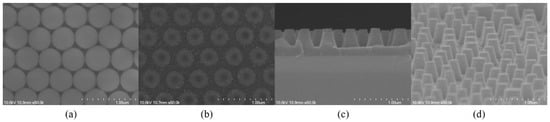 The monolayer of naturally dried PS beads covered the planar surface as shown in Figure 3a. To make a SiO2 layer with a diameter of about 300 nm, PS beads were dry etched by RIE to have a suitable diameter. Figure 3b shows the shape in which the diameter of the 400 nm PS bead was changed to about 300 nm by RIE etching after carrying out fabricating the SiO2 mask layer by RIE. The GaAs contact layer and InAlP window layer were etched using HBr and Ar gas by ICP. Figure 3c,d shows the SEM cross-sectional image and 45 °C tilted surface of the NT InAlP window layer, respectively. The NT InAlP window layer was applied to the GaAs 1J SC.