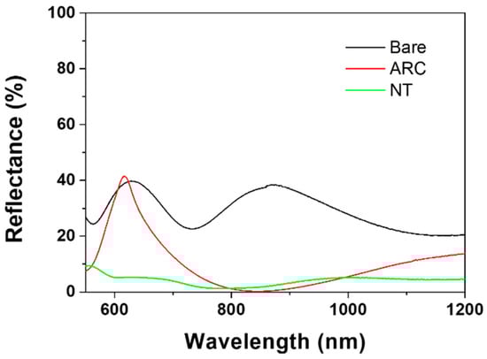 Figure 4 shows the spectra of specular reflectance measured on GaAs substrates with different surface conditions: the bare GaAs surface, the planar ARC surface, and the three-dimensional NT InAlP surface. Both ARC and NT surfaces exhibited suppressed reflectance compared to the bare surface. The planar ARC layer suppressed the reflectance through destructive interference effects caused by out-of-phase reflected waves of the light from interfaces between the bilayers of ARC and SC. The NT layer reduced the reflectance by gradually changing the refractive index by the moth-eye effect [,]. The noticeable distinction of the plotted reflectance–λ curves between the ARC and NT surfaces is the difference of λ range, where the reflectance is effectively suppressed compared with the specular, reflected, bare GaAs surface. The NT surface suppressed the reflection at a wide λ range from 550 nm to 1200 nm evenly, which covers the whole range of GaAs 1J SCs enough. The suppressed reflectance by the NT surface mainly originates in the nanoscale three-dimensional layer. Since the geometric features of the factor NT surface exhibit the most index grading from air to the device, a remarkably low reflectance is achieved. Whereas the planar ARC surface suppresses the reflectance at a partial λ range, approximately from ~750 nm to ~1000 nm, and consequently reveals a limitation of the planar ARC layer. As a result, the broad λ range of reflectance is more considerably reduced by the NT surface than the planar ARC surface.