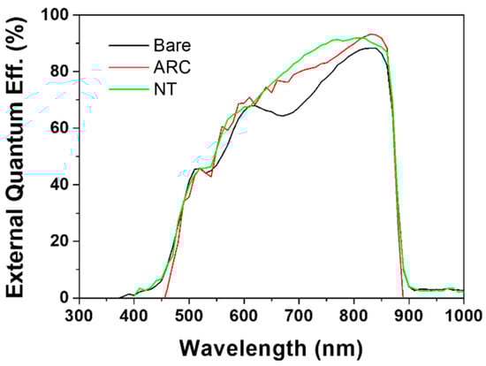 The effects of the surfaces with different conditions on the nanostructure are mostly smaller than the studied wavelengths; λ of the incident light regards the nanostructure as an effective medium, whose effective refractive index falls off the InAlP towards the bottom, significantly reducing the undesired reflectance through destructive interferences among the beams reflected from different depths into the nanostructure [,,]. As the effective medium provides a graded refractive index between the air and InAlP because of the increased space filling, the photocurrent generation by each SC was examined from the EQE spectra, as shown in Figure 5. The EQE spectra reveal that both ARC and NT surfaces benefit the carrier generation of GaAs 1J SC and elongate the diffusion length []. However, there is no significant difference of the EQE spectra between the ARC and the NT SC as plotted in Figure 5, whereas the reflectance spectra between the ARC and NT surfaces, as shown in Figure 4, present a distinct difference.