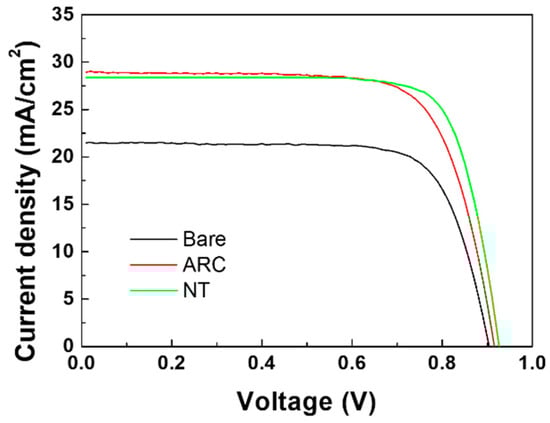 where is the current, is the charge of one electron, is the total power of photons, is the Planck constant, is the speed of light, and is the surface area of the device receiving the light. As a result, the improved J spectra of the ARC and NT SC compared to the bare surface SC was represented, as shown in Figure 6. The EQE of the ARC and NT SC increased similarly from the bare surface SC with no conspicuous offset between each other as shown in Figure 5; the J–V curves as plotted in Figure 6 reveal that the J of the ARC and NT SC increased with no conspicuous offset from the bare surface SC.