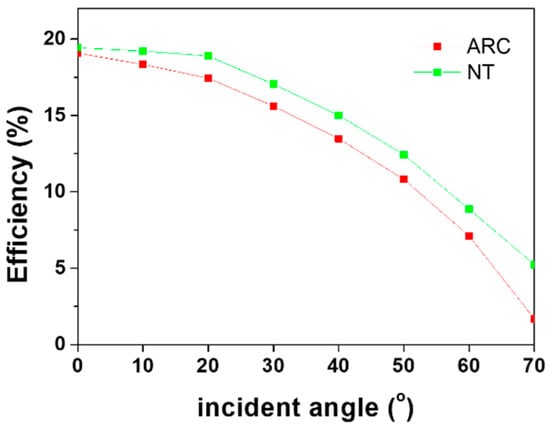 As shown in Figure 7, efficiencies were acquired with varying θ from 0 °C to 70 °C at intervals of 10 °C. The η of the NT SC is apparently higher than the η of the ARC SC at all ranges of θ. The η of the NT SC from 0 °C to 20 °C was almost preserved and the gaps of η between the NT and ARC SC were gradually wider from 50 °C to 70 °C. The η at 70 °C of the NT SC was about 3.2 times higher than the η of the ARC SC. It demonstrates that the NT surface alleviates the loss of η as θ increases compared to the planar ARC surface. Since the dimensions of nanotextures are increased in the bottom, the scattering effect becomes increasingly pronounced, and the incident photons are more likely to bounce back and forth among the NT surface. As a result, the optical path on the solar cell surface is prolonged, leading to enhanced absorption by the active region while θ is modified. Hence, the three-dimensional NT surface is distinguished from the planar ARC surface. It was found that NT SC has omnidirectionality.