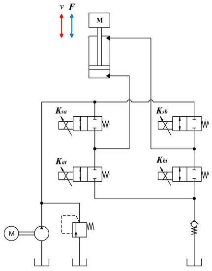 To reduce the throttle loss of the valve, the meter-in valve is opened to maximum and the meter-out valve is controlled using the VFPB method (shown in Figure 4). The maximum opened area of the meter-in valve decreases the throttling losses more compared to the meter-out valve [13]. The control valve signal, (K = sa, ab or bt), is combined with the velocity feed-forward control signal, , and the position feedback control signal, Upd, as given by Equation (1):