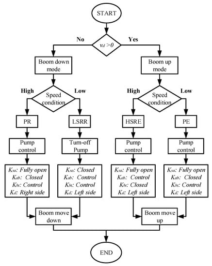 However, the test bench still exhibits some limitations. First, these studies only focused on the boom system, so the LSRR mode was omitted in the experiments. Second, the PE and HSRE modes were differentiated based on two factors, the velocity and load force. However, the load force in this test bench was a fixed value. Thus, the switching mode must be designed based on the speed to determine the mode of operation.