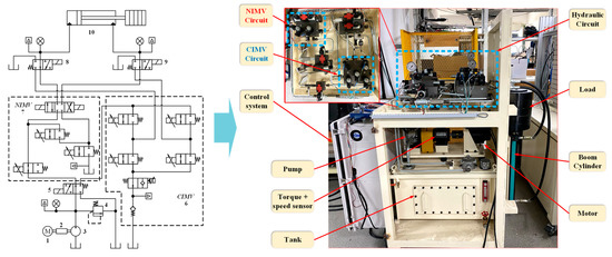The hydraulic boom excavator system was built to evaluate the effectiveness of the NIMV system and was also compared with the CIMV system. The NIMV (circuit 7) and CIMV (circuit 6) were designed in parallel, and had the same connection with hydraulic cylinder 10 (placed on vertical) and pump 3, as shown in Figure 5. The transition of two controllers between two circuits was performed via a switch that was connected with three 4/2 directional valves (one valve for pump outlet 5, two valves for inlet 8, and outlet 9 of the cylinder). The EHPVs of the system were solenoid proportional valve SP10-24 from HydraForce. The control signal range for the EHPV was from 0 to 10 V, the signal was converted from 0 to 24 V via the amplifier and was then transferred to the EHPV. The diameter of the piston was 40 mm, the rod diameter was 20 mm with a stroke length of 500 mm, and the cylinder was affected by a fixed load of 100 kg. The linear sensor, TLH-0500, was added to measure the position of the cylinder, and a pressure sensor was added to measure the pressure value of the valve, cylinder, and pump outlet. The relief valve was set at 100 bar to guarantee the safety of the system during operation. The experiment parameters are listed in Table 2.