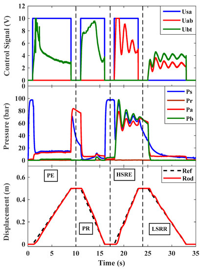 After the PR mode ends, the pump is turned on to maintain pressure Ps before starting the HSRE mode. In the HSRE mode, the cylinder moves at the target velocity at 100 mm/s from 18 to 25 s. The response time of the cylinder in this mode is slower than in the PE mode, because when the valve opens, the oil is supplied into both cylinder chambers. It then takes a long time to create a thrust difference between the bore chamber and rod chamber. Moreover, the lifting load pressure of this mode is higher than that of the PE mode because the oil circulates in a closed circuit, which causes a high pressure in the system. This pressure is higher than the setting pressure on the relief valve, leading to loss of flow in the system. Hence, it causes a higher energy consumption than in the PE mode (energy consumption of the PE and HSRE modes is shown in Figure 7 in Section 4.2).