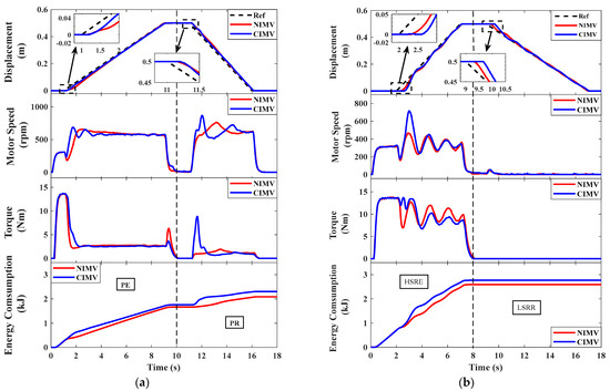 Figure 7a describes the energy consumption between the NIMV and CIMV in cycle 1. The energy consumption of the NIMV was lower than that of the CIMV, i.e., the energy-saving on the PE mode was 4% and that of PR was 22%. The reason is that the returned oil to the tank of the CIMV system needed to maintain a higher pressure than the setting pressure in the check valve. This leads to more energy being required from the pump. Therefore, from 1 to 2 s, the speed and torque of the CIMV system were higher because during this time the pump needed to supply a greater flow rate to reduce the delay response of the cylinder. Similarly, from 11 to 12 s in the PR mode, the cylinder moved down unimpeded in the NIMV system (does not have a check valve), so the torque from the motor was very low. Thus, this system has better energy savings than the CIMV system. However, with more used energy, the CIMV system can achieve a better tracking performance in the early stage. The comparison is evaluated based on the displacement tracking error, as shown in Figure 8a. Although the displacement error of the NIMV is higher in the early stage (from 1 to 5.5 s), it is closer to the target position after that (similar to the PR mode).