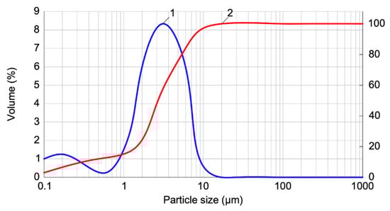 Curve of distribution of Km-2 grade micro calcite particles by size: 1—curve of the partial distribution of particles of a certain size (particle size) in percentage (along the left ordinate); 2—curve of the total distribution of particles as a percentage (on the right axis of ordinates).