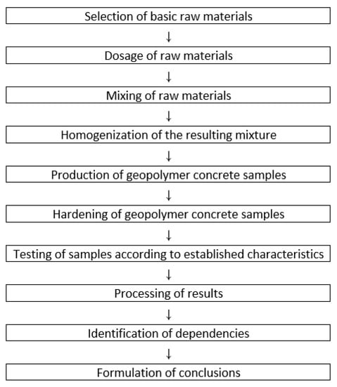 To summarize the literature review results, it should be highlighted that the choice of environmentally friendly components for geopolymer concrete and correct composition adjustment is crucial from the technological point of view. Therefore, the formulation and determination of concrete composition’s qualitative and quantitative features for environmentally friendly construction, research on a macro and micro level of relationships between recipe and technological factors, and structure formation and properties in geopolymer concrete are fundamental. Thus, having determined the lack of scientific research on the chosen topic, this article develops its plan and methodology for conducting experimental research and analysis.